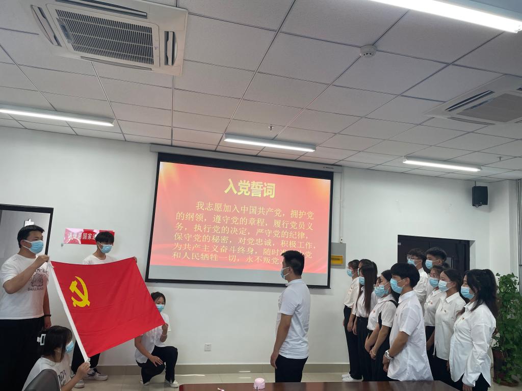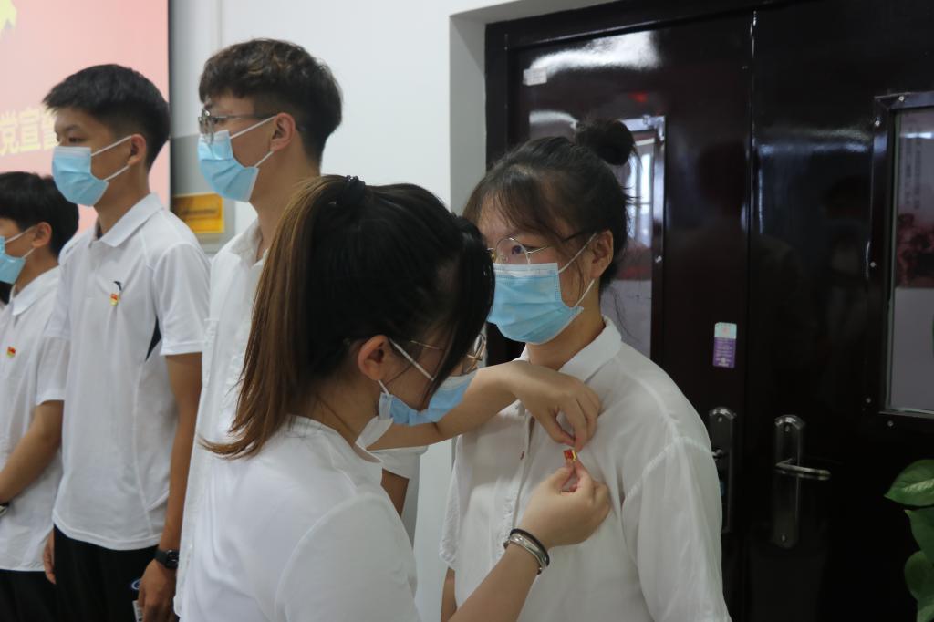 党员教师为新接收的预备党员佩戴党徽,在党旗前进行了庄严的宣誓,声音高亢洪亮,真正展现出对党的崇高敬意。