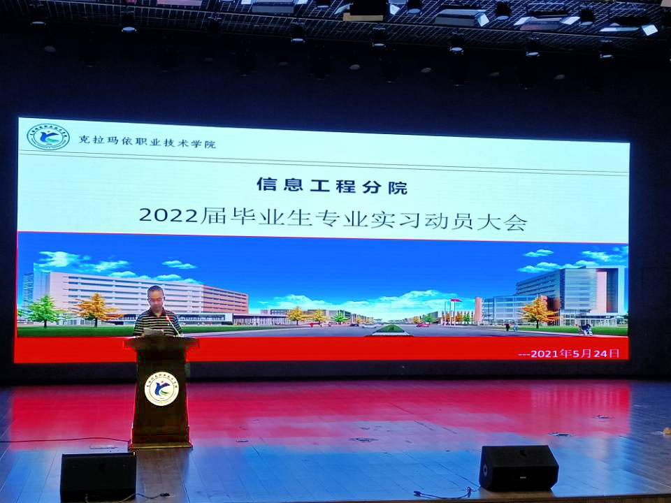 为提高学生的安全意识,推进2022届毕业生毕业实习工作,5月24日下午18:00,克拉玛依职业技术学院信息工程系2022届毕业生安全教育暨毕业实习动员大会在J2一楼学术报告厅召开。出席本次会议的有信息工程系2022届全体毕业生、毕业班各班级班主任老师、信息工程系党支部书记田娟老师、系主任陈辉老师、辅导员吐尔逊麦麦提老师、马肖老师。会议由吐尔逊麦麦提老师主持。
