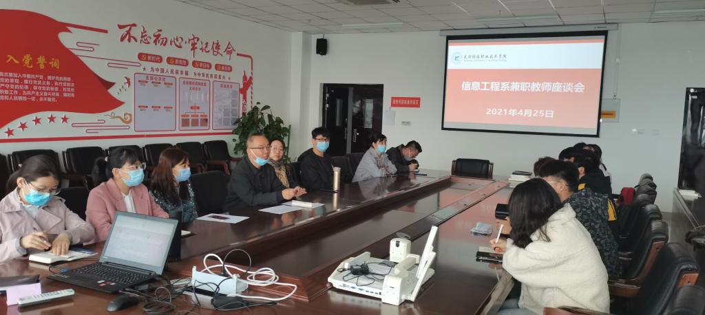 2021年4月25日下午,信息工程系召开了兼职教师座谈会。会议由陈辉主任主持,参与本次会议的有副主任杨静老师、教研室主任、本年度的兼职教师以及兼职教师的指导老师。