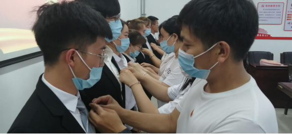 接着举行了入党宣誓仪式。在刘花丽老师的带领下,预备党员进行入党宣誓,老党员重温誓词,并为预备党员佩戴党徽,党员们的誓词高亢激昂,在会场久久回荡。最后,党支部书记田娟老师对本次7名“新”预备党员表示了祝贺并提出了更高的要求,希望他们坚定信念,砥砺前行,积极发挥党员的先锋模范作用,成为一名真正合格的共产党员。