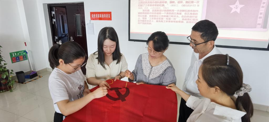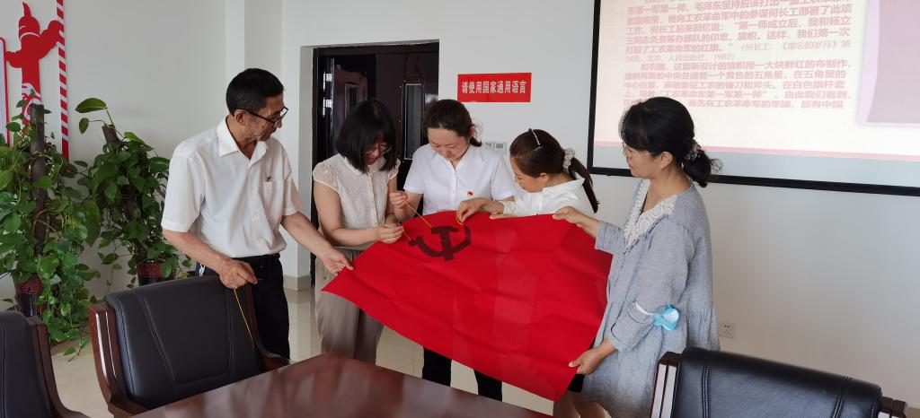 6月2日下午18:00在C3-II510会议室,党支部书记田娟老师带领大家学习了党旗党徽的故事。通过学习,使大家进一步了解到中国共产党的党徽党旗由来。党徽为金黄色的镰刀和锤头组成的图案,党旗为旗面缀有党徽图案的红旗,红色象征革命,金黄色象征光明。锤头、镰刀代表工人和农民的劳动工具,象征着中国共产党是中国工人阶级的先锋队,代表着工人阶级和广大人民群众的根本利益。接着,伴随着“线儿长、针儿密,含着热泪绣党旗”悠扬的曲调,大家开始穿针引线,轮流认真地在鲜红的党旗上落下每一针。党员同志们齐心协力,绣着党旗诉说着党史,把爱党、敬党的浓浓情感融入亲手绣制的党旗之中。