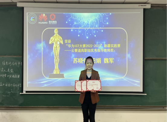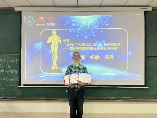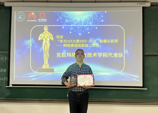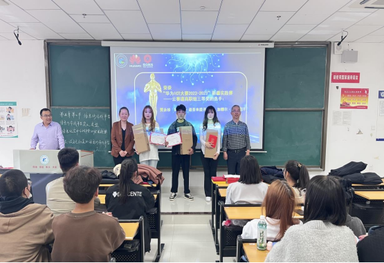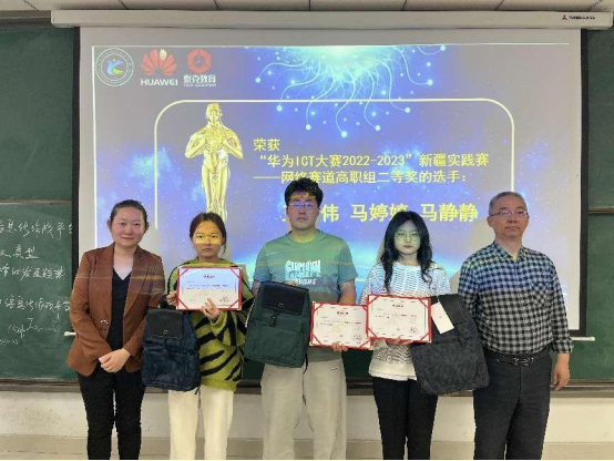 信息工程分院主任陈辉老师首先为获奖的同学们表示祝贺,并鼓励2022级的同学们积极参加2023年度华为ICT大赛。陈辉老师给同学们加油鼓劲,鼓励同学们积极考取华为认证,努力提高自己的专业技能,为祖国的数字产业大发展做出贡献。接下来,华为第三方教育机构泰克教育新疆区裴光辉总经理宣布了获奖情况,由田娟老师及陈辉老师为获奖选手及指导教师颁发了证书及奖品并合影留念。