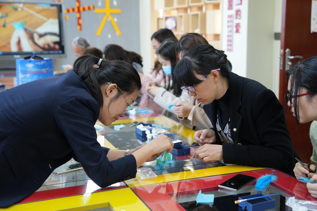 点翠工艺,在清代时期达到顶峰,高超的技艺水平充分体现了古代劳动人民的卓越才能和艺术创造力。老师们使用光泽感好、色彩艳丽的羽毛代替翠鸟的羽毛,运用点翠工艺做成发饰佩戴起来,犹如幽幽湖水上点点灵动的浮光魅影。