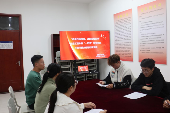 活动第三项,由学生代表发表了感受,刘志义同学说道:“听了各位老师以及同学的故事后,我深深感受到了我们是站在巨人肩膀上观看世界,我虽然是从甘肃来到这所学校,但我被故事中的有着石油精神的前辈深深折服,习近平书记说过“人民有信仰,民族有希望,国家有力量”,我们作为青年一代,更要好好学习,把握当下。”