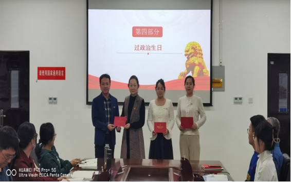 第四项:过政治生日,首先由学院党委委员、副院长尹涛同志为过政治生日的田娟、刘花丽、贾娇娇赠送政治生日卡和生日礼物。其次,由魏军同志带领全体党员重温入党誓词,最后由三名过政治生日的老师依次追忆入党初心谈感受。田娟老师说:首先入党是一种心灵的净化。我认识到,入党的过程实质就是认识党、热爱党、发展党和捍卫党的过程,不能存有任何私心杂念,更不能带有功利欲和虚伪心。其次,入党是一种觉悟的提高。作为一名党员通过实际工作和生活,团结、影响和带动身边的同志。第三,入党是一种特殊的奉献。立党为公,执政为民,党的宗旨就在于全心全意为人民服务。刘花丽老师说:这是我第一次被提起过政治生日,算算我已经有16年党龄了,到现在也算是年轻的老党员了。2013年我进入克拉玛依职业技术学院担任专任教师岗,从入职后,我肩上多了一份责任那就是教书育人,也让我对党员的身份有了更加清晰的认识,知道自己所肩负的责任和使命。我参加系部组织的政治学习,主题党日活动、三会一课活动,在学习的过程中才知道,原来学习政治理论,学会讲政治、讲规矩、守纪律、有担当,是可以用于实践,是可以指导工作的,甚至可以教我怎样做人,在这个过程中,其实还有很多的恍然大悟。贾娇娇说:作为一名党员,我将珍惜党组织的培养,牢记自己的入党初心和使命,始终坚守党的宗旨,全心全意为人民服务。作为一名辅导员、高校思想政治工作者,我将不断努力学习新知识、新技能,高标准、严要求干好自己的本职工作。以严于律己、勤奋务实、刻苦钻研的工作作风做好党组织安排的各项工作。守好初心,担当尽责,改进不足,增强党员意识和党性观念,为推进学院“双高建设”和职业本科建设做出自己应有的贡献。